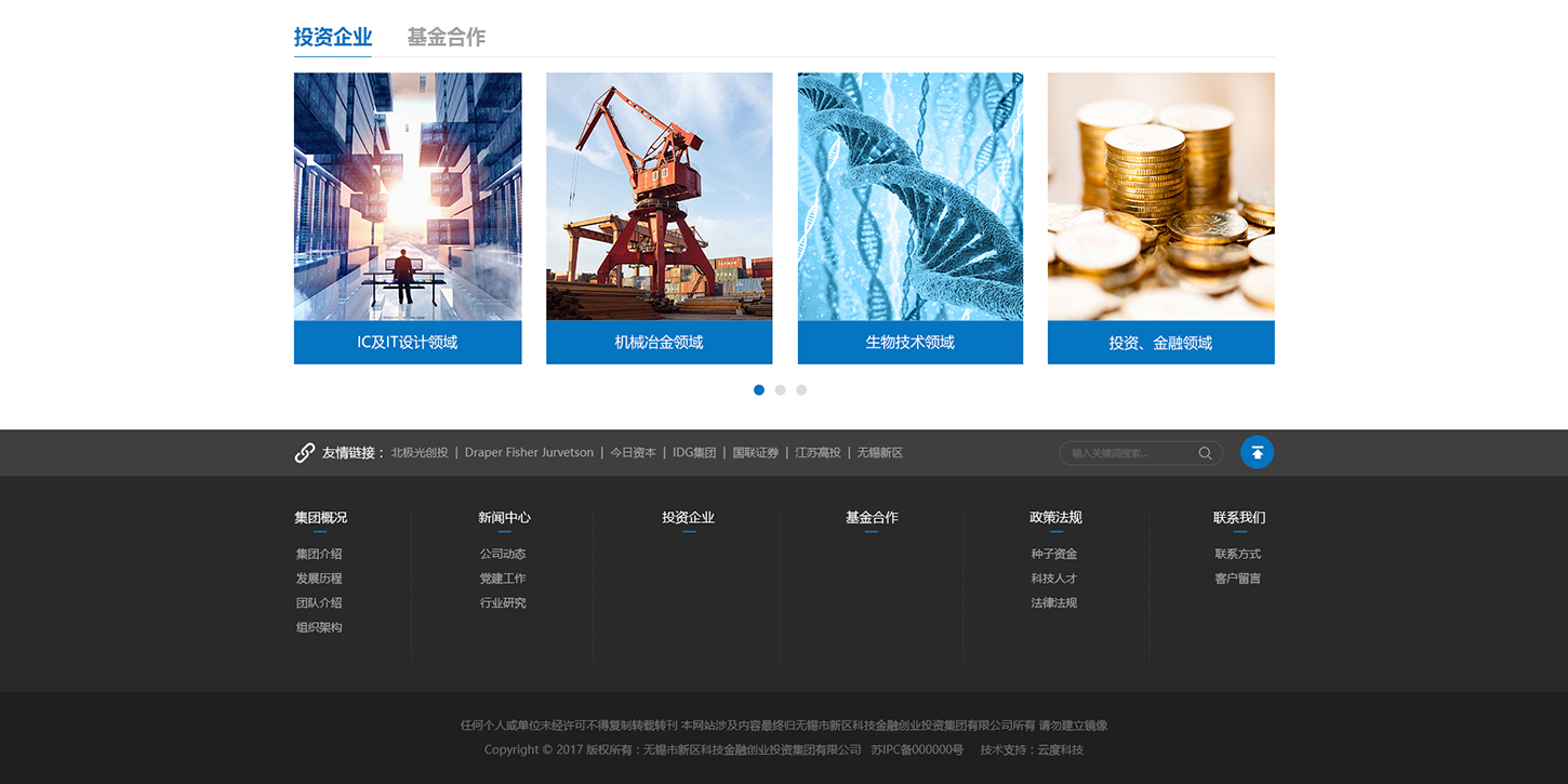 无锡市新区科技金融创业投资集团(简称"新投集团")成立于2008年,主体由无锡新区科技金融创业投资集团有限公司、无锡新区领航创业投资有限公司、无锡新投金石创业投资管理有限公司组成,参股或控股无锡高新技术风险投资股份有限公司、无锡市新区创友融资担保有限公司,以及部分无锡高新区科技企业和投资基金等。