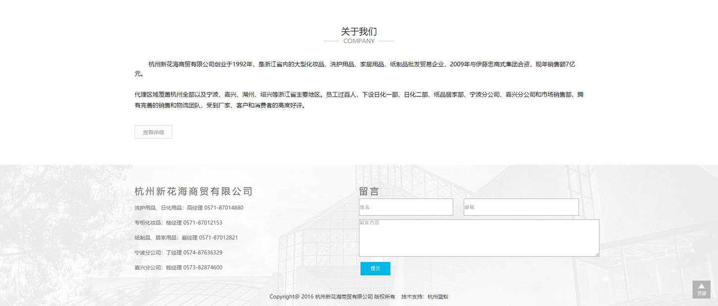 代理区域覆盖杭州全部以及宁波、嘉兴、湖州、绍兴等浙江省主要地区。员工过百人,下设日化一部、日化二部、纸品居家部、宁波分公司、嘉兴分公司和市场销售部,拥有完善的销售和物流团队,受到厂家、客户和消费者的高度好评。